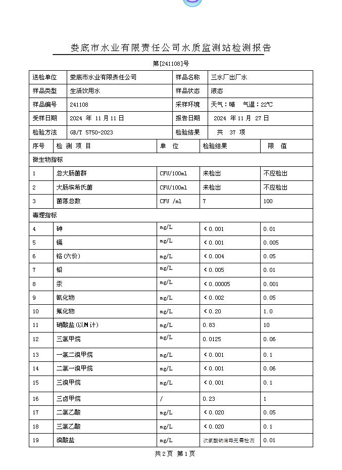 2024年11月三水廠出廠水水質(zhì)公告
